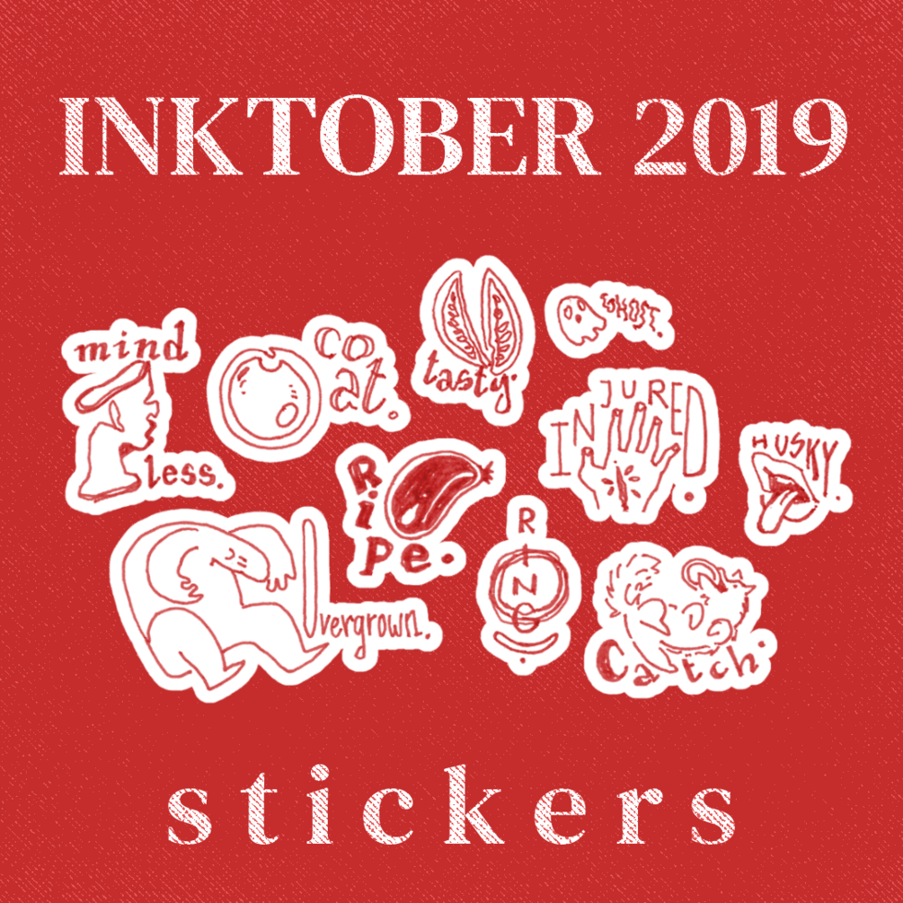 A set of 10 selected drawings from my inktober! They're all different shapes and sizes, but for reference, the Ghost sticker is approximately 2x1,5 cm.